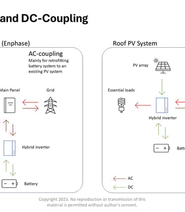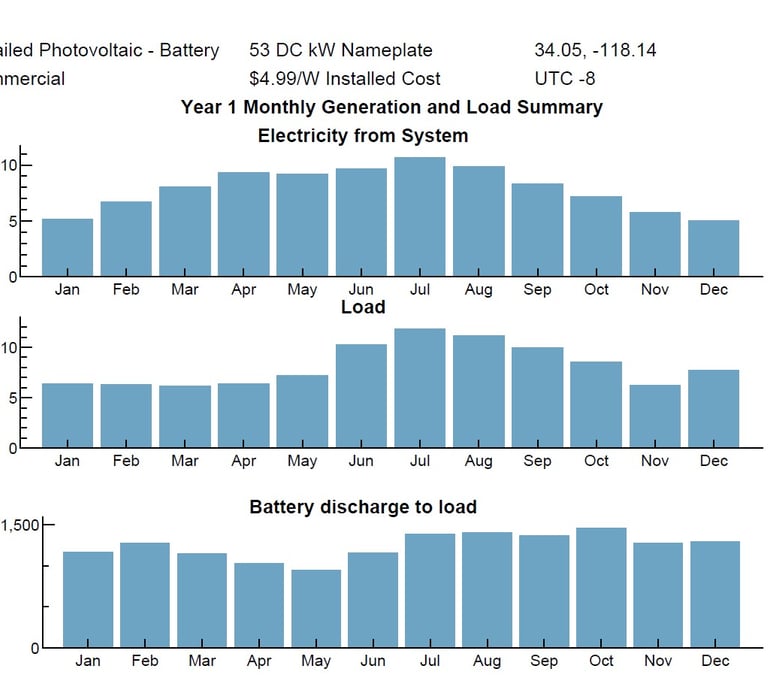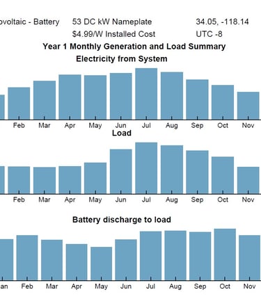 A preliminary layout of the system is designed, then detailed energy modelling of the system with real weather data is ran. Parametric study can be made to see the variations in solar generation and battery usage versus load consumption. System sizing can be determined without or without financial modelling.